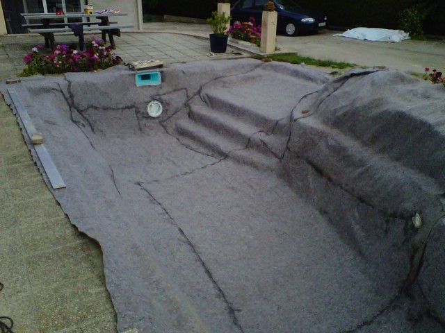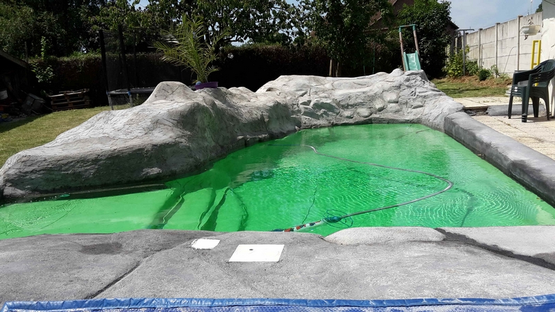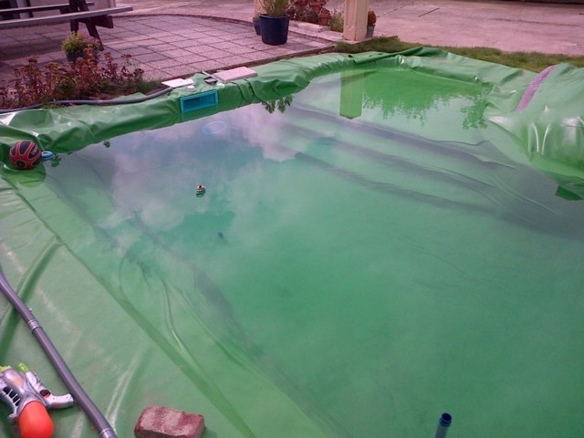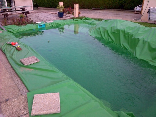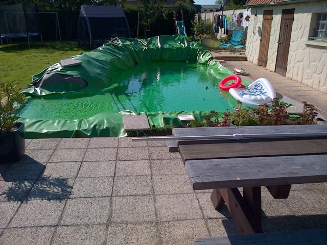 The construction of the pool was labourious because of the bad weather in May and June 2012 but after 205 hours of work and a sum of 4900€ including accessories and cleaning and maintenance products, the pool can be used. Please note that I chose a green grass colour membrane which is 1,5mm thick (which represents twice the thickness of the lining of a classic concrete pool).