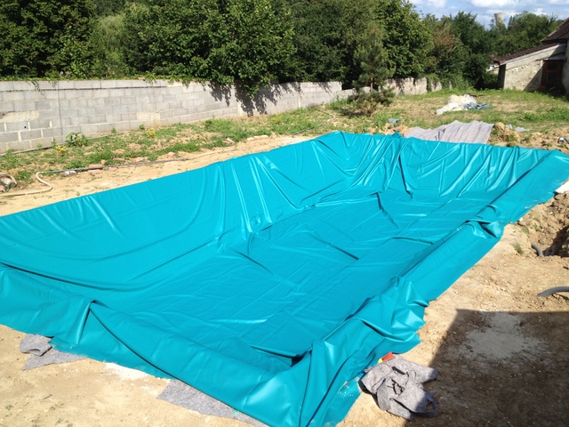The method described in Mr Liaigre's work has been adapted for this project. The rectangular shape of the pool was studied with CAD to keep the formation of folds to a minimum. All the inclined slopes were covered with a layer of concrete so that they would be as smooth as possible before the geotextile was laid.